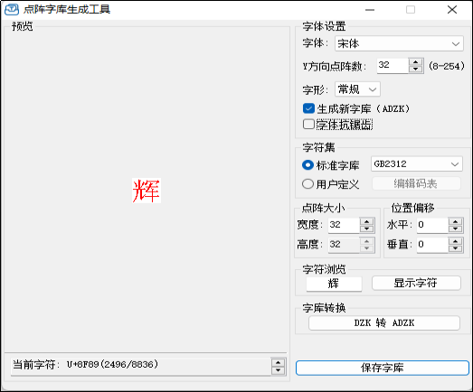 除了使用上述方法生成新的帶壓縮的ADZK字庫外,還可以直接將現有的DZK字庫轉換為帶壓縮的ADZK字庫。點擊圖5左下角“DZK轉ADZK”可以實現該功能。
